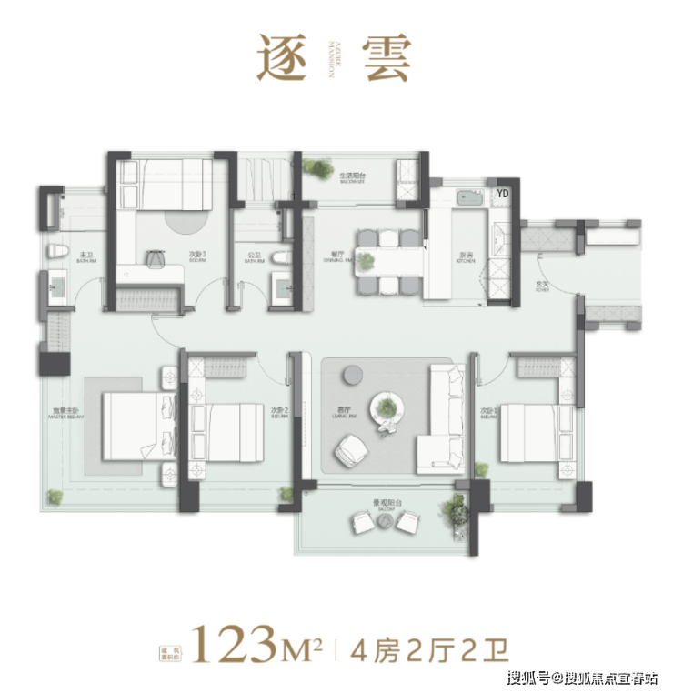 招商青雲臺的123㎡户型作为项目的起步户型,堪称改善四房的“性价比之王”。该超新规户型为四房两厅两卫设计,使用率高达112%,奢阔尺度可媲美市面上140㎡以上户型。户型集双入户玄关、南北双阳台、卧室平权等亮点于一身。南北通透双阳台设计,生活阳台收纳琐碎,景观阳台则可封窗实现真正的LDKG一体化。