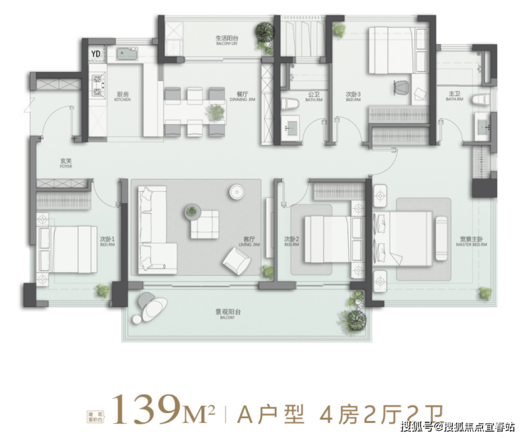 139㎡A户型可理解为123㎡户型的升级版,保留南北双阳台设计,主阳台双开间约8米宽。