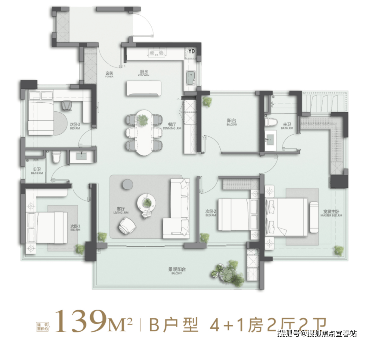 139㎡B户型的创新之处在于可实现4+1房设计,北侧阳台被巧妙预留为X空间,业主可根据需求将其打造成书房、健身房、儿童游乐区或电竞房。若客厅连通次卧打通,该户型依旧能保留4房的设计格局,灵活适应不同家庭结构的需求。