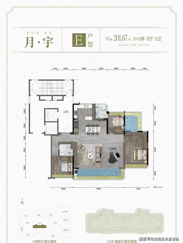 E户型: 建面约201.67㎡ 3+1房2厅3卫