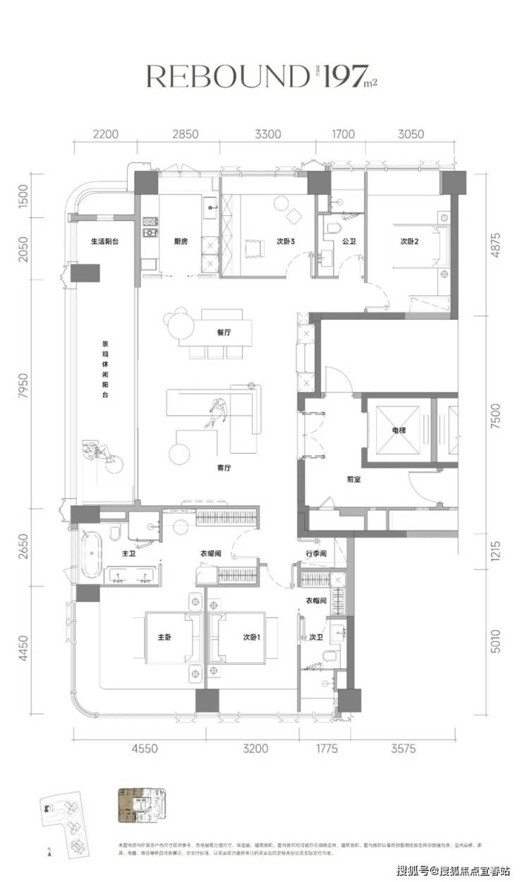 197㎡的4房2厅3卫,设计的是竖厅双龙抱珠格局,一梯一户,专梯入户设计,赠送私用电梯厅,客餐厅7.95米开间,LDKB一体化设计,四开间朝南,分别做到了主卧28.2㎡/次卧套间18.3㎡/次卧14.87㎡/次卧11.71㎡(包含墙体飘窗),客厅连接餐厅出10米长的超大观景阳台约22平,U型厨房,卫生间干湿分离,得房率约100%(包含赠送),西南朝向。