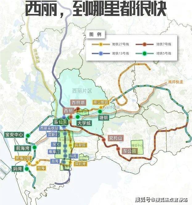 西丽综合交通枢纽(规划中) ——汇集4高铁(赣深客专、深茂铁路、深汕高铁、深珠高铁)、2城际(深惠、深莞增城际铁路)、4地铁【地铁13号线(在建中)、15/27/29号线(规划中)】的湾区枢纽。