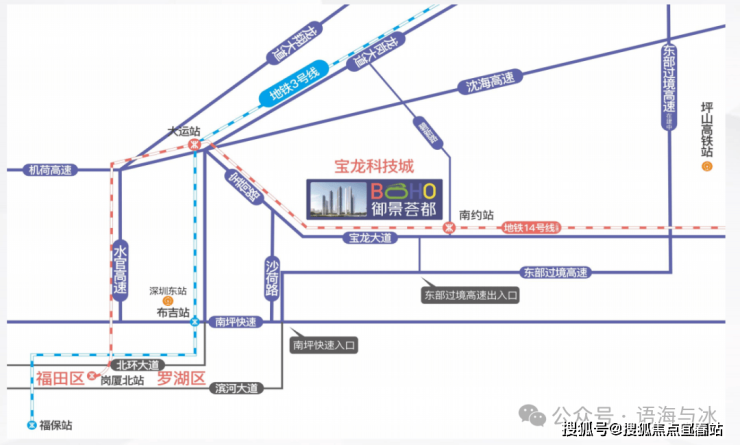 京基御景荟都,位于龙岗区碧新路与宝荷路交汇处,东侧200米是已经开通运营的14号地铁线“南约站”,碧新路东侧是宝龙科技城;宝荷路一路之隔对面是比亚迪以及正在建设中的宝龙生物药创新发展先导区,西侧是已经成熟的居民区(仁恒峦山美地,卓弘高尔夫雅苑,振业峦山谷等)