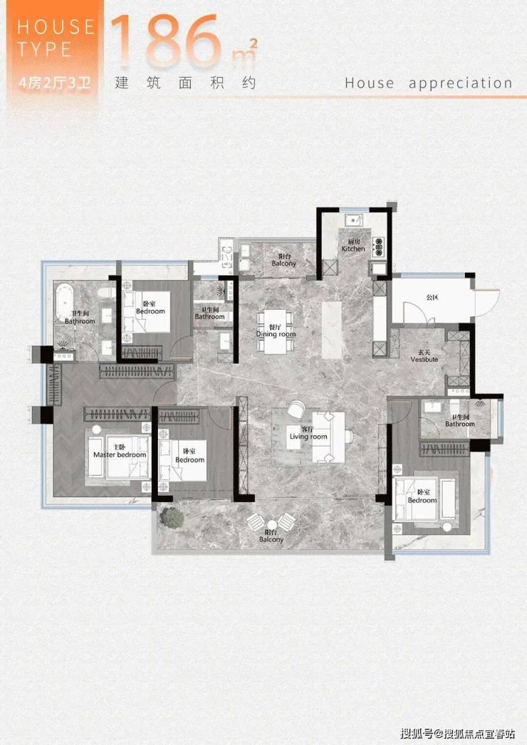 餐厅宽约 4.3 米,客厅开间最大 6.1 米(可传统布局或 “去客厅化”);主卧 / 次卧带 270° 飘窗,东南望园、西南望墅;全屋开窗面大,采光视野拉满;景观禀赋最大化。