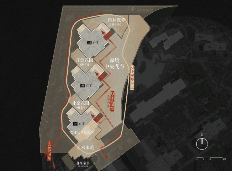根据规划,未来二期将打造“一亭两带一环三园”,串联起整个组团和各个架空层空间,而且通过园林景观打造“六境归家礼序”,无论业主选择哪条路归家,都有景可赏。