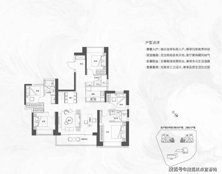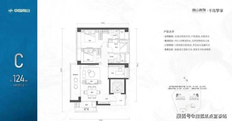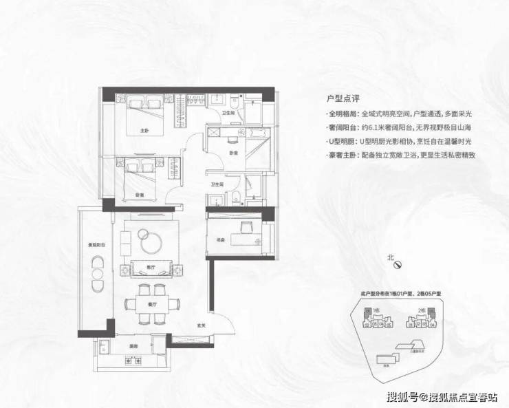 【124㎡的4房2厅2卫】1栋01/2栋05户型,电梯入户送独立公区,横厅南北通透格局,客餐厅6.1米开间,五开间朝南,主卧大套间设计,6.1米长观景大阳台,U型厨房,得房率:72.07%(不含赠送)西北或东南朝向;