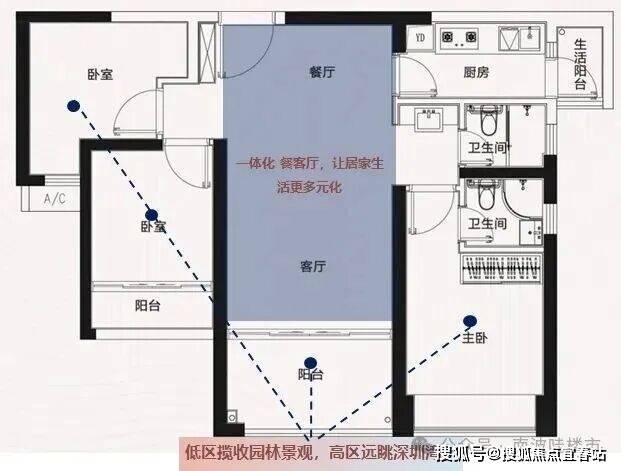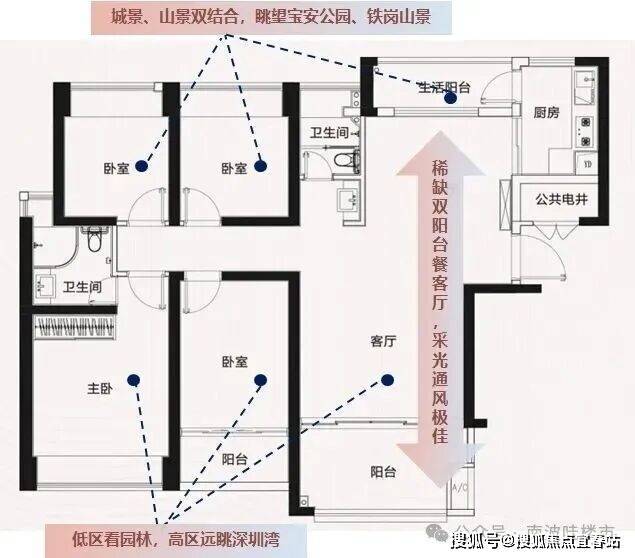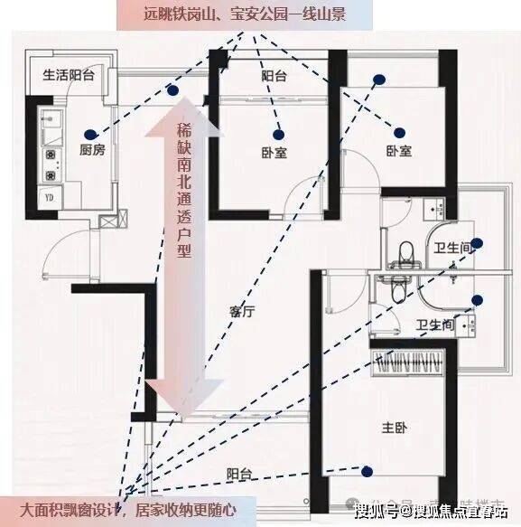 阳台阔绰:前海稀缺在售89㎡三房两卫三阳台,客厅阳台进深1.9米,揽收城园双景