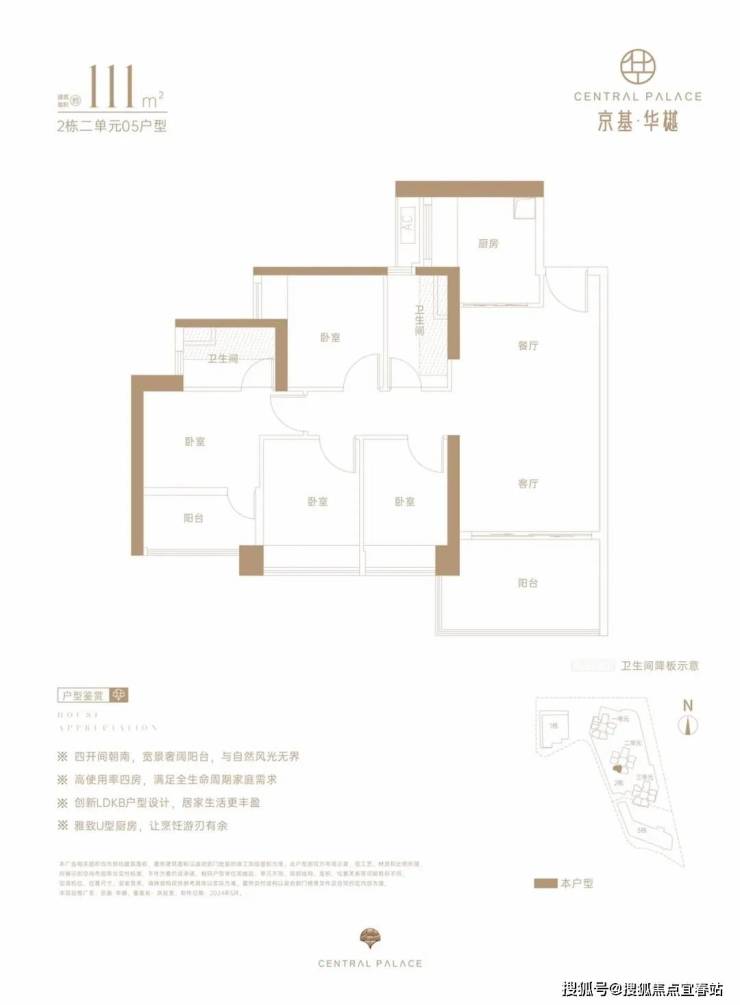 仅2栋2单元05户型才有,设计的是经典竖厅格局,LDKB一体化,动静分区,四开间朝南,U型厨房,卫生间干湿分离,得房率约73%(不含赠送),阳台西南朝向。
