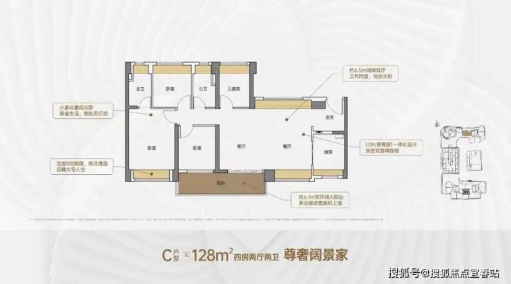 128㎡的4房2厅2卫,设计的是横厅南北通透格局,客餐厅6.5米开间,进门户玄关,LDKB一体化,客厅连接次卧出6.1米长的大阳台,主卧大套间设计,全屋8处飘窗,U型厨房,卫生间干湿分离,阳台主朝南向。