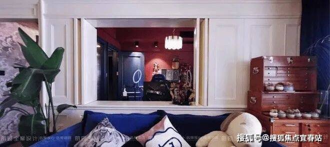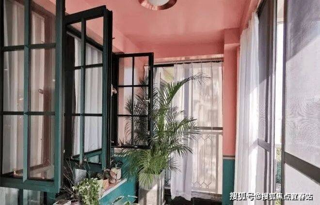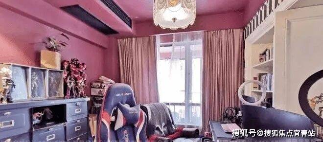 与客厅相连的是女主工作&休闲的空间,恰到好处的调节室内光线,让空间显得情调而美好,设计师大胆配色,皮粉色墙面以及吊顶,增加了空间活力色彩又不失美感。