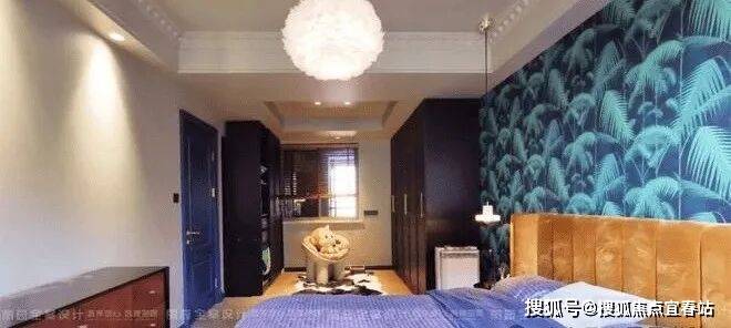 秉持自然的理念,设计师在主卧室加入了许多自然元素,原木色和墨绿色的搭配让整个卧室宛如丛密森林,清爽气息扑面而来。墨绿色的床头背景搭配绒面质感的床,多了几分韵味,把主卧塑造成为了家中花园,充满精致而又个性的美。