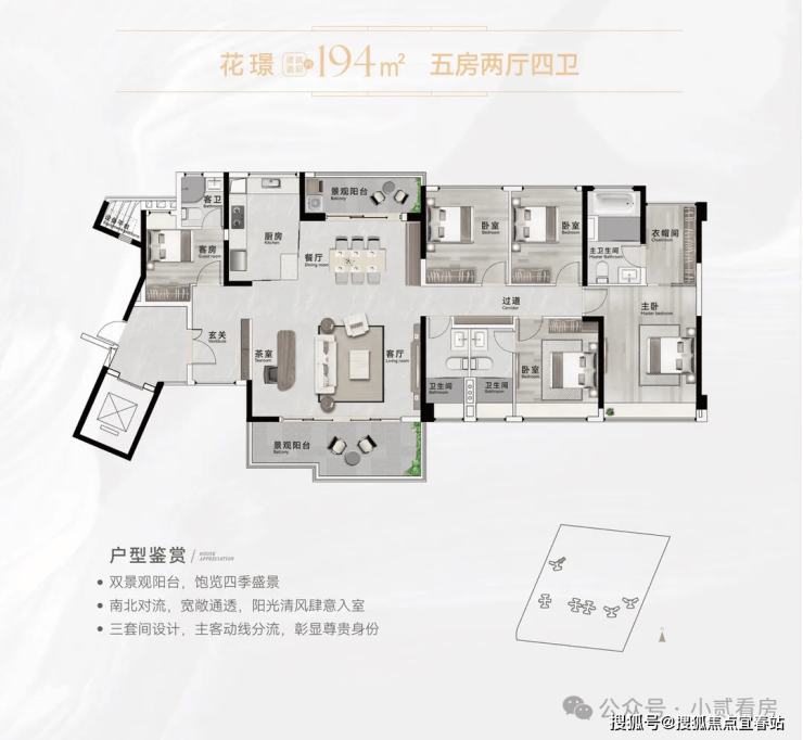 【194㎡五房2厅4卫(三套房)】南北对流双景观阳台,观景生活两不误