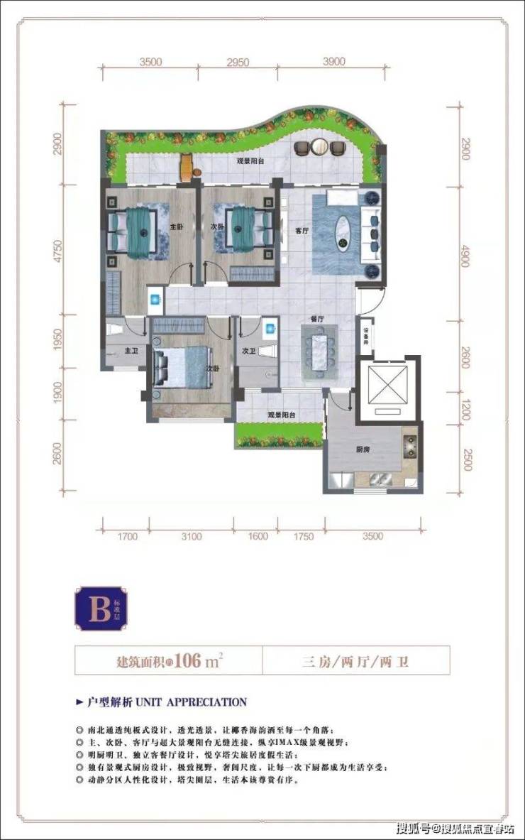 🎏 B户型 三房两厅两卫双阳台建面约 106 ㎡,实得约 139 ㎡
