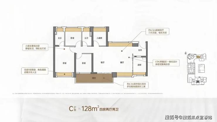 竖厅格局,客厅3.5米开间,LDKB一体化,S墙设计预留冰箱卡槽位,客厅连接次卧出5.9米长的大阳台,主卧双面飘窗,次卧270°转角飘窗,全屋6面飘窗,U型厨房,卫生间干湿分离。