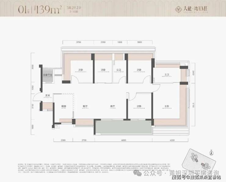 亮点:该户型为正5房2厅2卫,四面采光 + 270°精装主卧飘窗+6.8米巨幕海景阳台,5个房间均为标准尺寸。