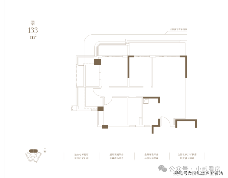 建面133㎡户型,独立电梯前厅,悦享归家礼序,超阔观境阳台,收藏揽山美景。
