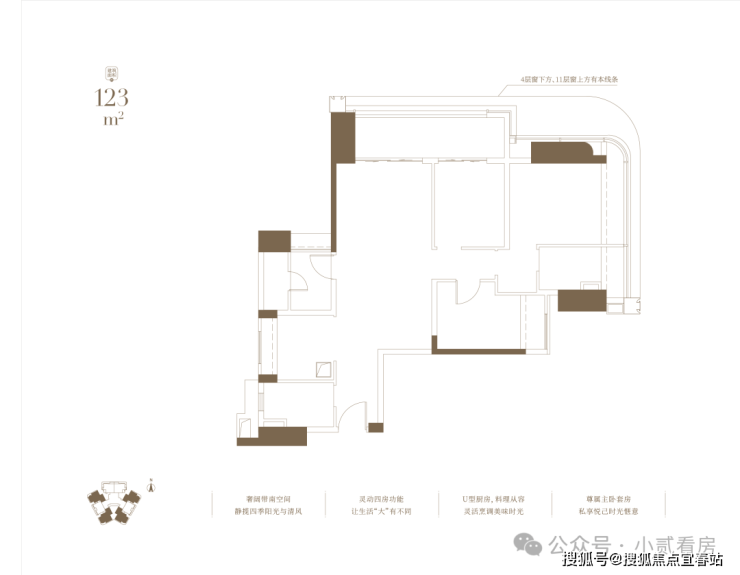 建面123㎡户型,灵动四房,U型厨房设计,料理从容,尊属主卧套房,私享悦已时光。