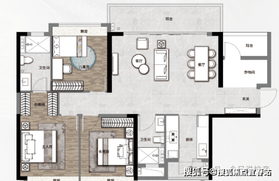105㎡三房两厅两卫,三开间朝南的三房户型,约3.9m的大开间竖厅,动静分离;双阳台设计,望一线园景、山景。