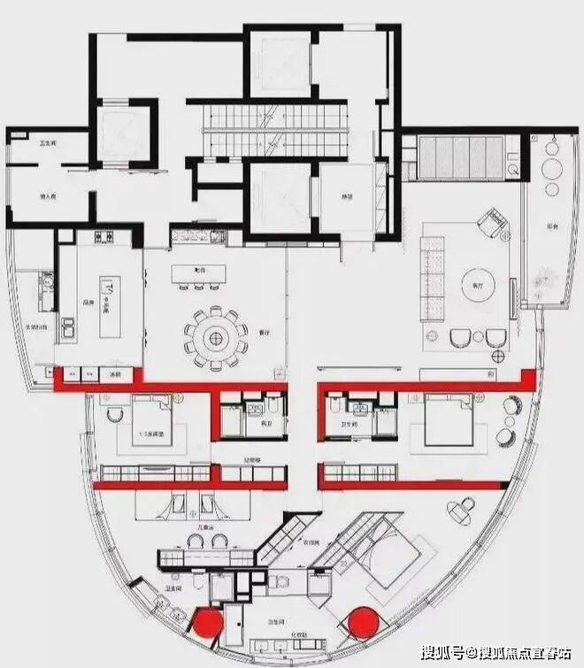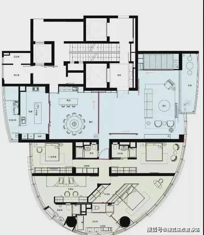 因为建筑本身结构关系。在空间布局上,我们更多的考虑到公共区域,主卧室及小孩房的布局
