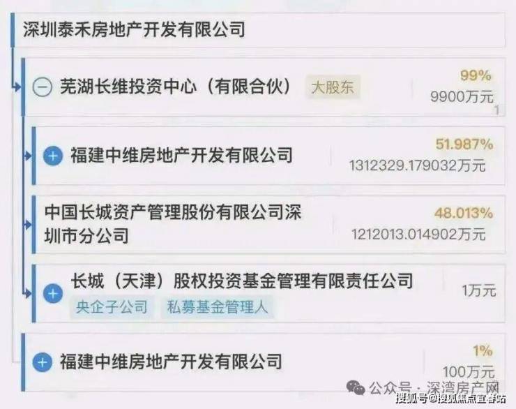 据企查查,按照最新认缴出资情况,芜湖长维投资中心为大股东,直接持股比例高达99%;泰禾实控的福建中维房地产开发有限公司,认缴出资额仅为100万元,直接持股比例1%。而芜湖长维投资中心股权穿透之后,长城资管持股比例达48%。