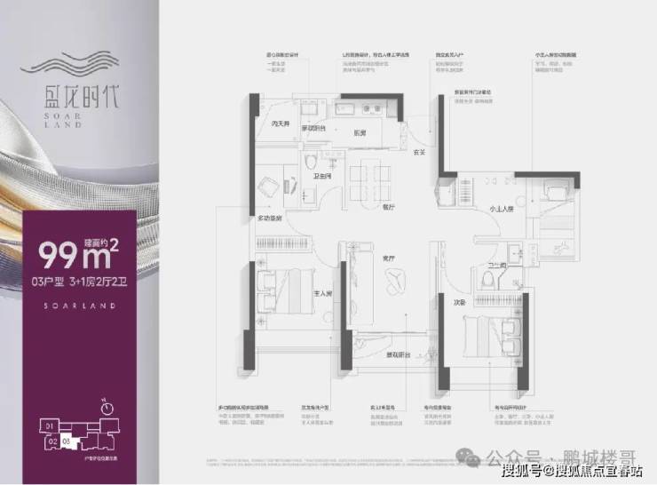 面向三代同堂 一步到位的建面约99㎡3+1房2卫