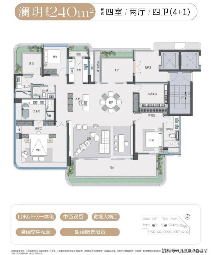 玄关处序厅中轴线布置,左翼动区(Gala Wing)为客餐厨+阳台+家政空间,在去年流行的“全景舱”概念与其顶尖旅居产品理念结合,拓展了超大观景阳台,打破纯玻璃盒子的封闭感,向户外延伸;右翼静区(Land Wing)为主卧套房和两个次卧套房的休息空间,其主卧套房布局将卧榻区、卫生间和阳台以礼序轴线规整布局,全空间通宽延伸至户外阳台,尽显深改楼王级产品的平墅奥义。