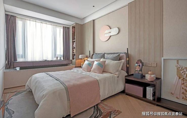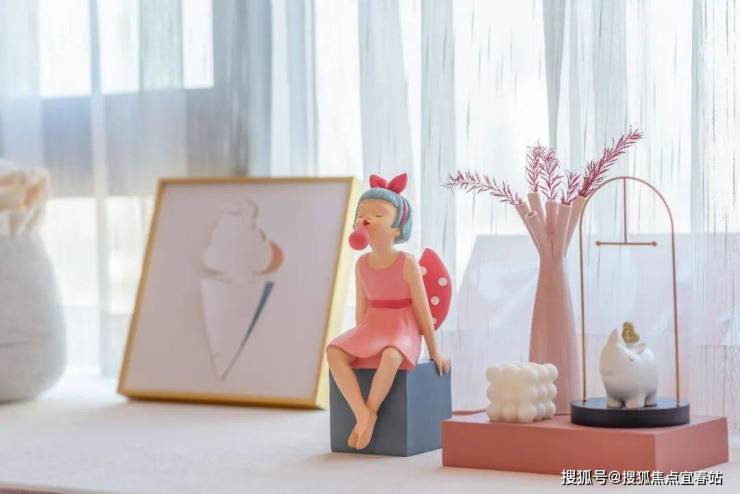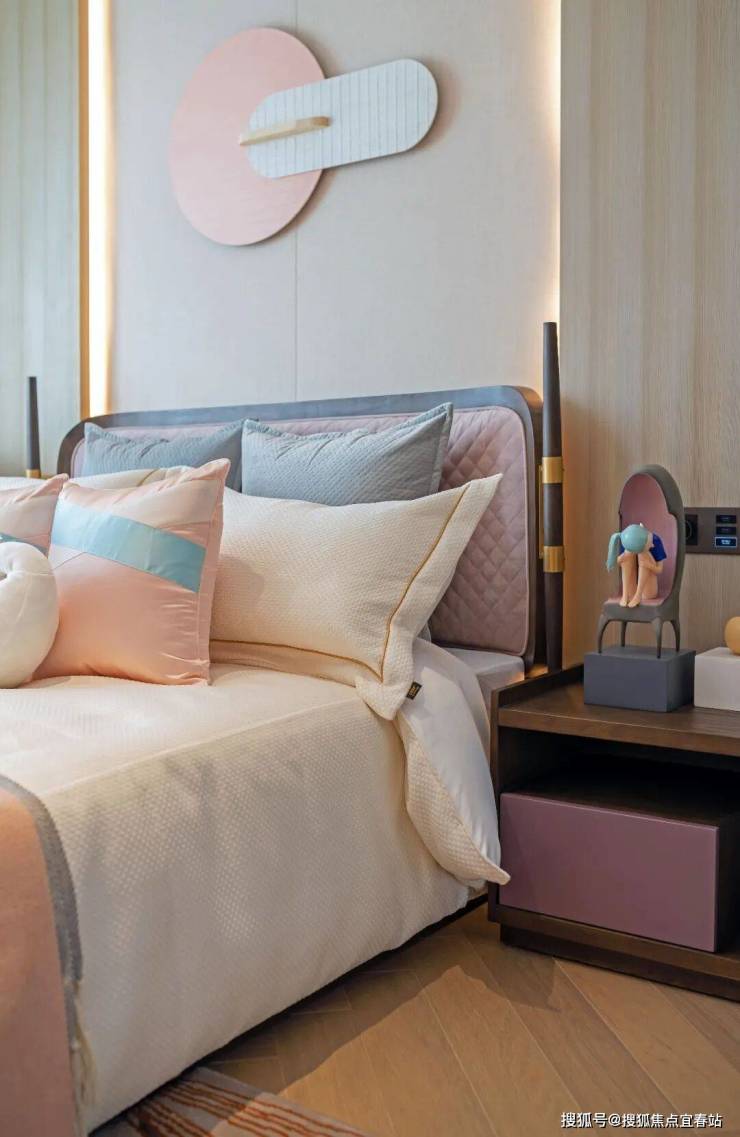 次卧的设计亦散发着梦幻的当代艺术气息。有序陈设的床品、摆件等小细节,营造出童真趣味的意境。