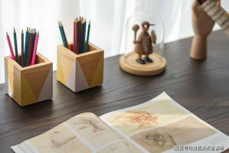 书房书桌运用圆弧型台面,刚好满足小尺度空间的使用,窗台旁的一组彩色电镀玻璃坐凳及火柴人促成的小场景,体现了居住者独特的生活品味与情趣。
