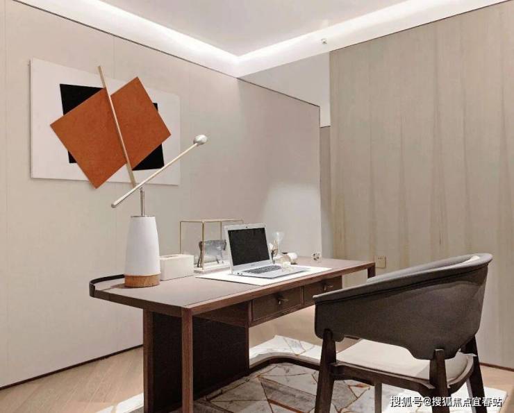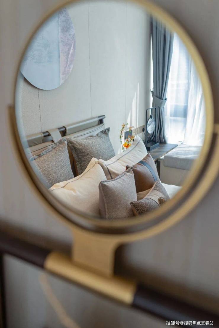 次卧空间的气韵清丽柔雅,配上传统门扣手的装置东方意味十足。墙面上的装置画是设计对东方语素的延展,金属蚀刻的粗狂被空间极致地展现出来,洒脱且随性。