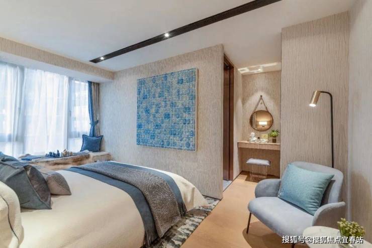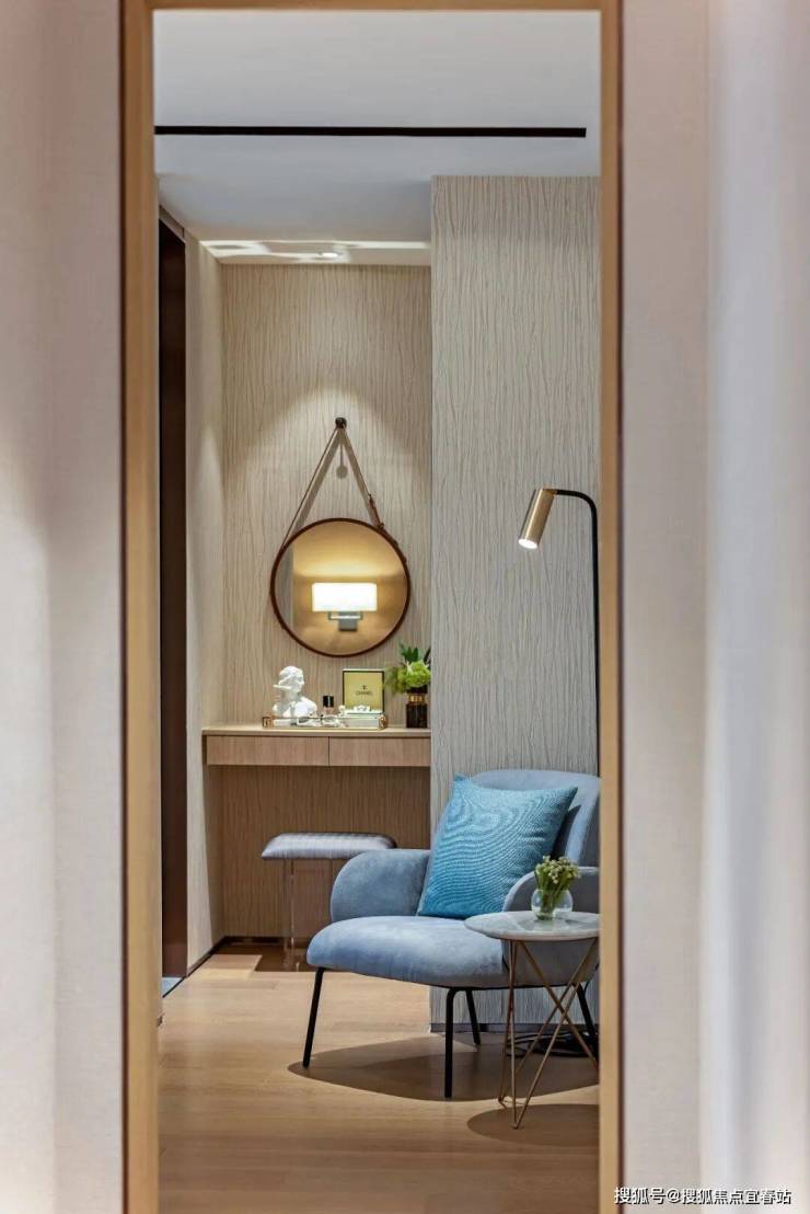 卧室的色彩哲学同样运用温柔清新的笔触营构。背墙硬包不甘平庸,与床品丰富的纹理配合,拼贴出时尚气质。