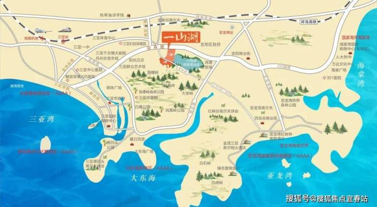项目东靠20万方小西湖湿地公园,南侧背靠海螺岭、凤凰岭,15~30分钟以内可达三亚湾、大东海、亚龙湾、海棠湾