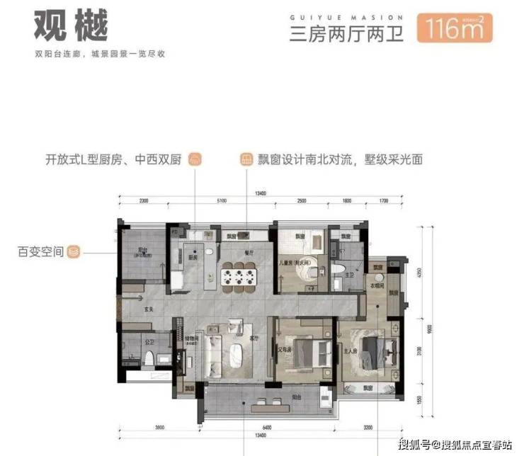 116㎡3房2厅2卫:奢华方厅•LDK厨餐客厅阳台一体化云端会客方厅:轻奢社交场南向园景,南北通透,赠送面积多约6.4米IMAX视野跑道式阳台,多功能生活场域LDKG一体化:餐客一体中西双厨,促进家人情感交流与亲密体悟,次卧可打造成客厅开放式L型厨房:洄游式餐厨动线,人体工学精妙比例主卧套房约5.5㎡高定独立衣帽间,对流藏景,以园区为镜,收藏您的每一面