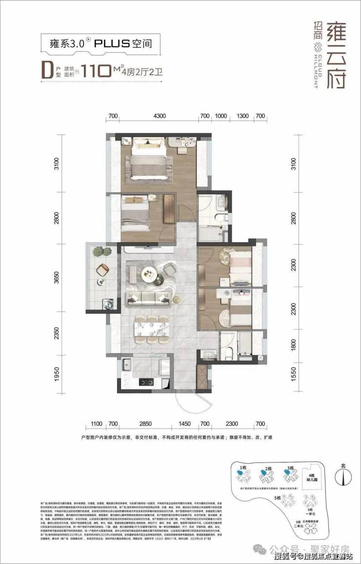 110㎡的4房2厅2卫,设计的是横厅南北通透格局,客餐厅一体化6米开间,4个卧室分别是3.1/2.8/2.3/2.3米的宽度,L型厨房,公卫三段式分离设计,得房率:78.7%(不含赠送),阳台主朝西南向。