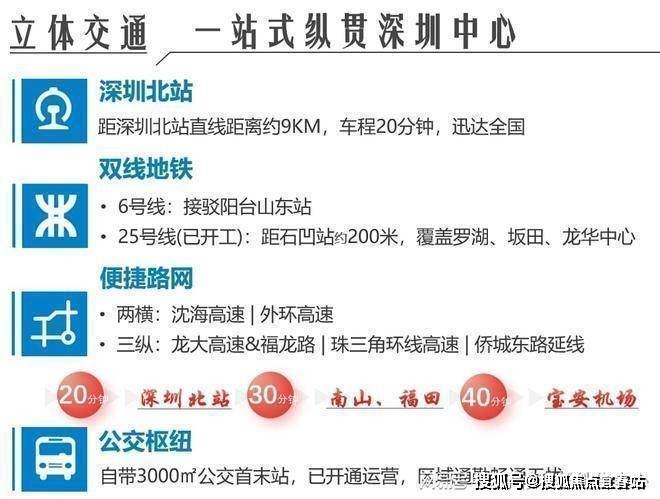 深圳北站为亚洲大规模城际枢纽;外环高速、机荷高速、龙大高速、福龙路、侨城东路北延路加快城际互联辐射;多轨道环绕,悦享便捷通勤