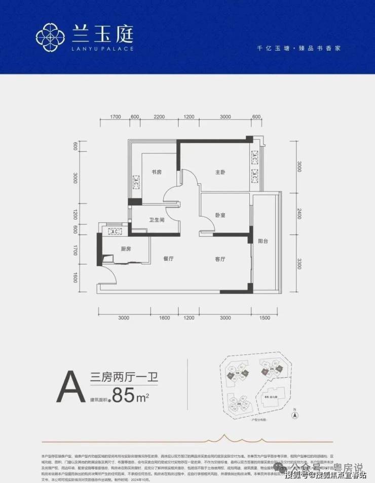 85㎡的3房2厅1卫,A户型,设计的是竖厅格局,客厅开间3.3米,LDKB一体化,三开间朝南,3个卧室分别做到了3米/2.8米/2.4米的宽度,客厅连接次卧出5.7米长的大阳台,L型厨房,得房率约79%(不含赠送),西南或东南朝向。