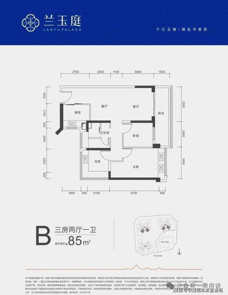 85㎡的3房2厅1卫,B户型,设计的是竖厅格局,客厅开间3.3米,LDKB一体化,三开间朝南,3个卧室分别做到了3米/2.7米/2.4米的宽度,客厅连接次卧出5.7米长的大阳台,L型厨房,创新式三分离卫生间,得房率约79%(不含赠送),西南或东南朝向。