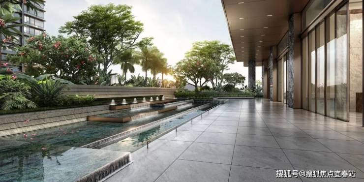 第五重,雅奢单元大堂,叠水花园与单元对景,增强入口的归家氛围。