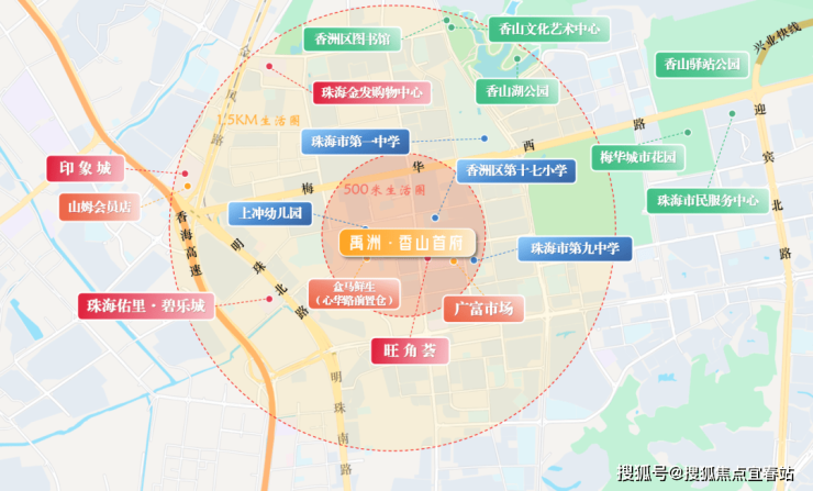 范围再扩大一些,就能将山姆会员店、香山湖公园、珠海一中等一大批商业、公园、教育配套纳入生活圈,让主城生活的精粹成为自己的日常。