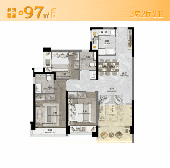 比如,建面约97㎡的三房两厅两卫,轻松承载二孩家庭的美好生活: