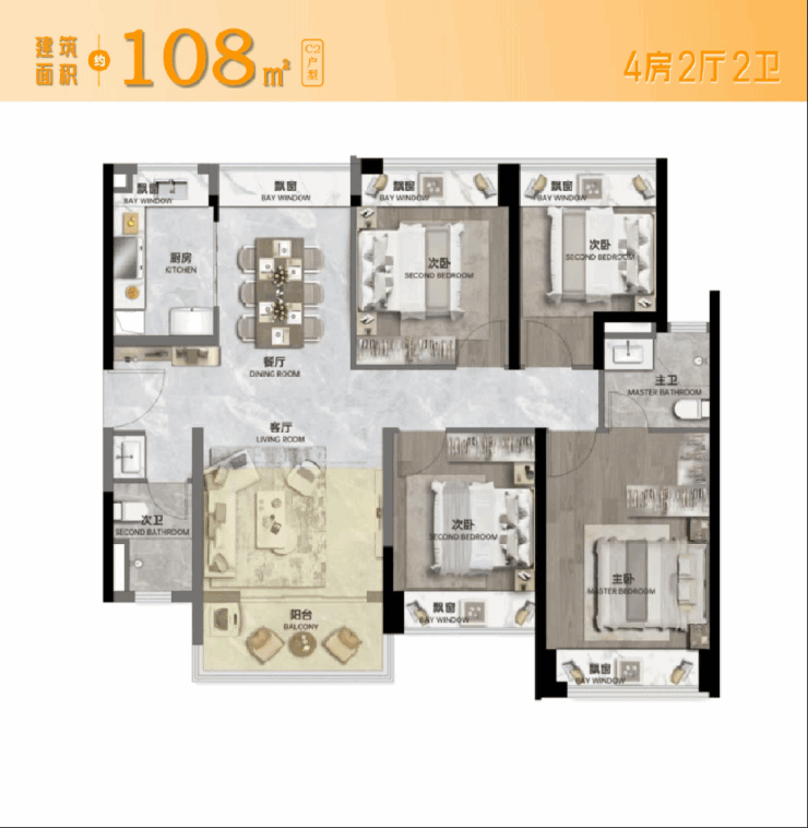 还有建面约108㎡的大四房户型,足以实现三代+二孩家庭欢聚一堂的舒适生活。