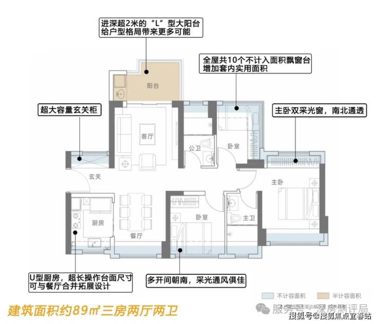 ●配备局部进深达2.1米、约6.2㎡的L型大阳台;