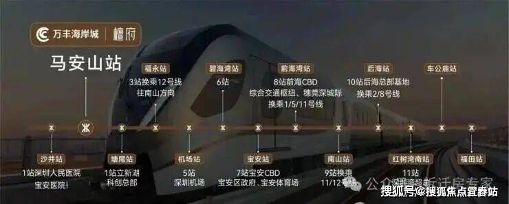 地铁11号线是深圳城市的快速动脉,可无缝换乘1号、2号、3号、5号、6号、7号、9号、12号线等8条地铁线路。从马安山站出发,5站即达宝安机场,7站抵达宝安中心区,快速连通深圳全城。