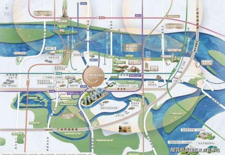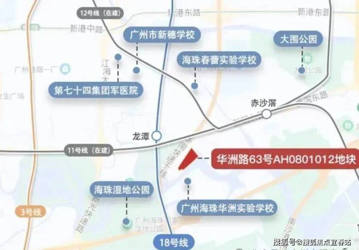 项目坐落于广州中心城区海珠区之心,华洲路旁,西侧为广州海珠湿地公园,南侧邻石榴岗河,距离地铁11号线(在建)和18号线换乘的石榴岗站约1200米,距离琶洲南TOD不到两公里。