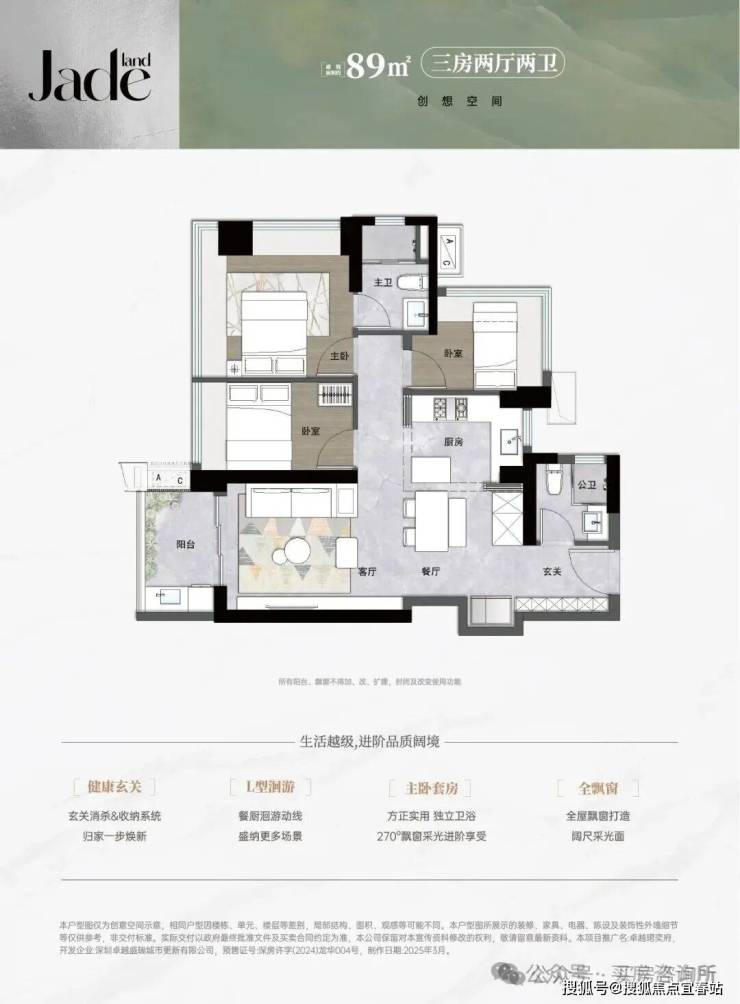 3栋89㎡的3房2厅2卫,设计的是经典竖厅格局,进门入户玄关,LDKB一体化,S墙设计预留冰箱卡槽位,三开间朝南,主卧+1个次卧270度飘窗,L型灵动式厨房,卫生间干湿分离,得房率约92%(包含赠送),西南或东南朝向。