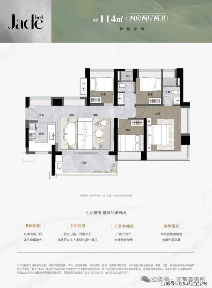 114平㎡的4房2厅2卫,设计的是横厅南北通透格局,进门入户玄关,LDKB一体化,五开间朝南,全屋9面飘窗,主卧大套间,U型厨房,卫生间干湿式分离,得房率约92%(包含赠送),阳台主朝东南向。