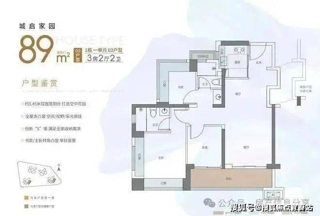 东南或西南朝向,竖厅设计,客厅有预留冰箱位,客厅,主卧,次卧分别朝南,户型一共有8个飘窗,加上阳台和飘窗使用率在90%左右。