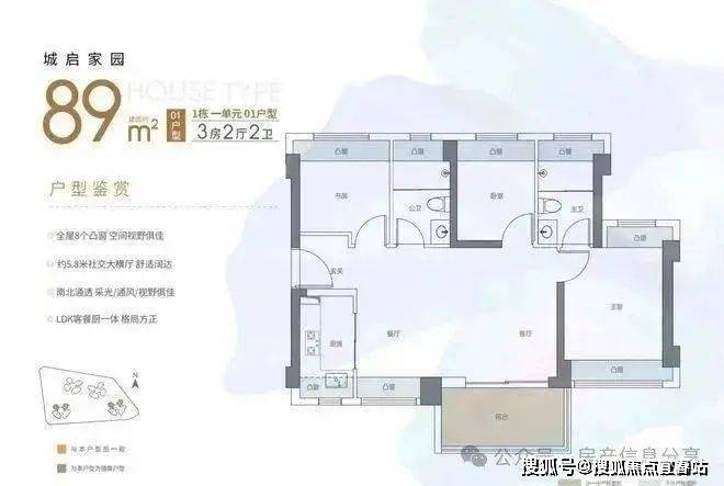 西南或东南向,户型是横厅南北通透格局,客餐厅5.8米开间,主卧双飘窗南北通设计,8个飘窗加阳台使用率在90%左右。