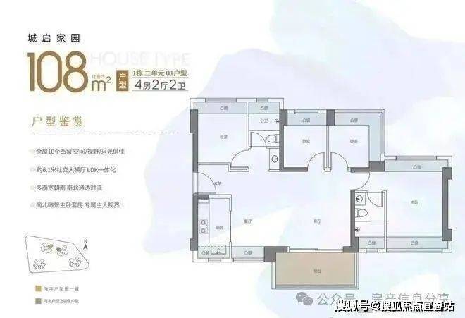 108㎡的4房2厅2卫,西南或东南向,横厅南北通透格局,进门独立玄关,客餐厅6.1米开间,主卧双飘窗通透设计,全屋10个凸窗,飘窗+阳台使用率在90%左右。