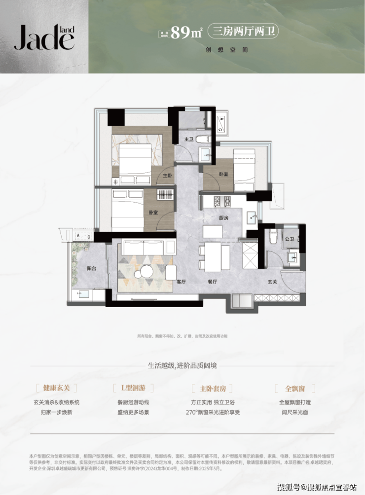 89㎡的3房2厅2卫,设计的是经典竖厅格局,进门入户玄关,LDKB一体化,S墙设计预留冰箱卡槽位,三开间朝南,主卧+1个次卧270度飘窗,L型灵动式厨房,卫生间干湿分离,得房率约89.35%(包含赠送),西南或东南朝向。