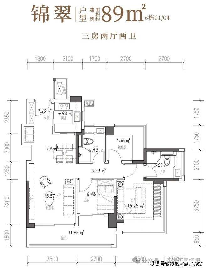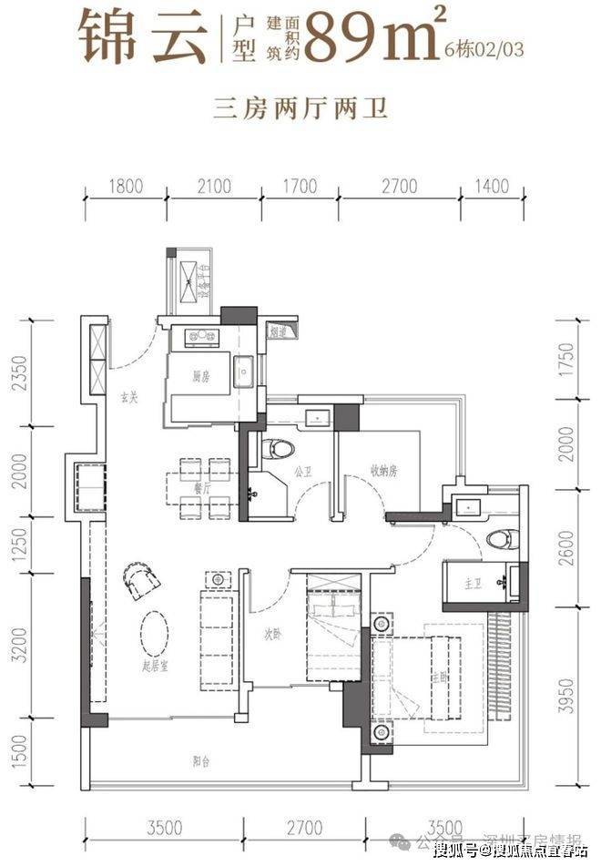 89㎡的3房2厅2卫,6栋02/03户型,设计的是经典竖厅格局,客厅3.5米开间,LDKB一体化,S墙设计预留冰箱卡槽位,三开间朝南,动静分区,主卧+次卧270°无柱转角飘窗,分别做到了主卧15.25㎡/次卧7.56㎡/次卧6.48㎡(包含墙体飘窗),U型厨房烟道外置,卫生间干湿分离,得房率约97.47%(包含赠送),客厅连接次卧出大阳台约11.46平,西南或东南朝向。主要区别在于次卧跟主卫空间。